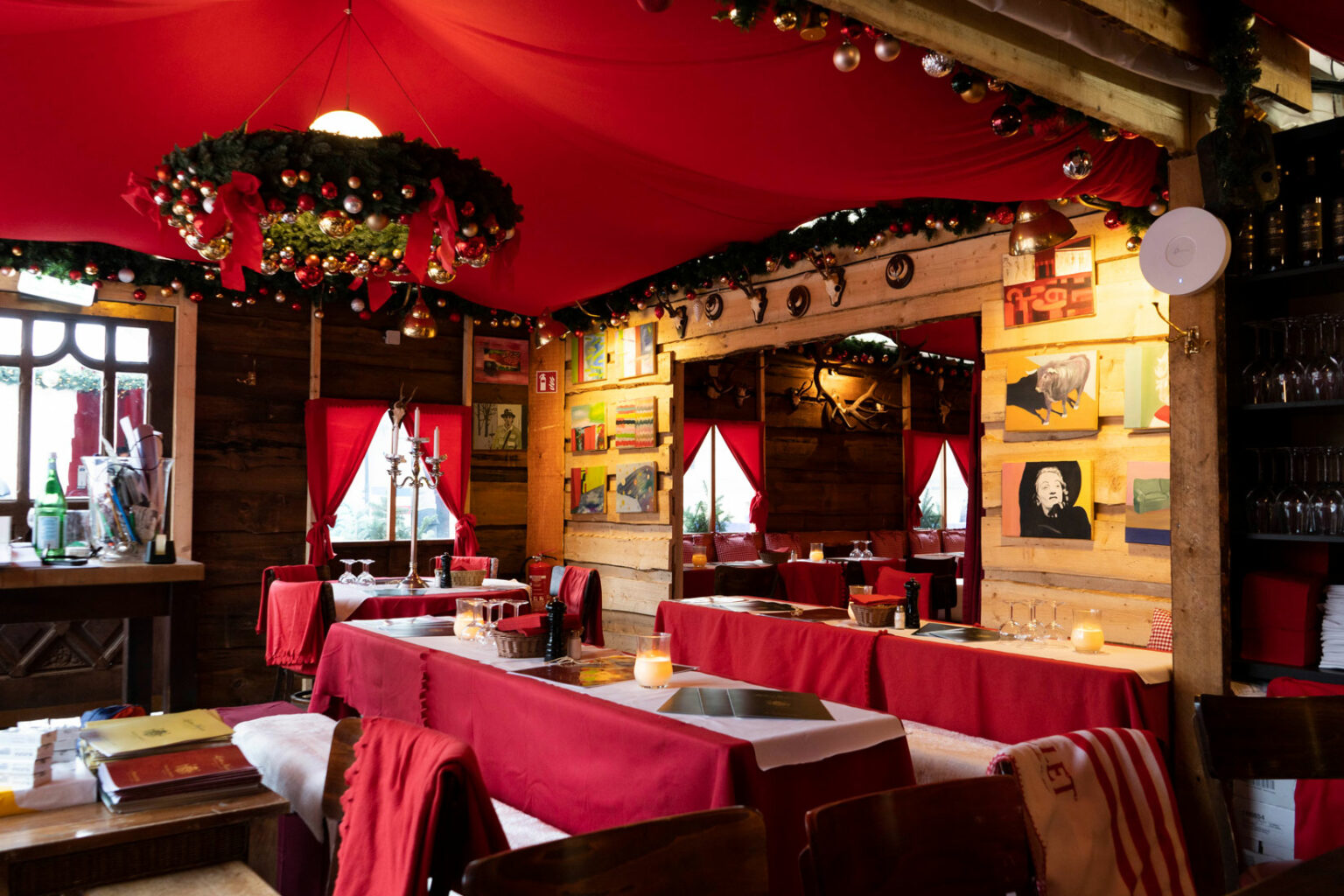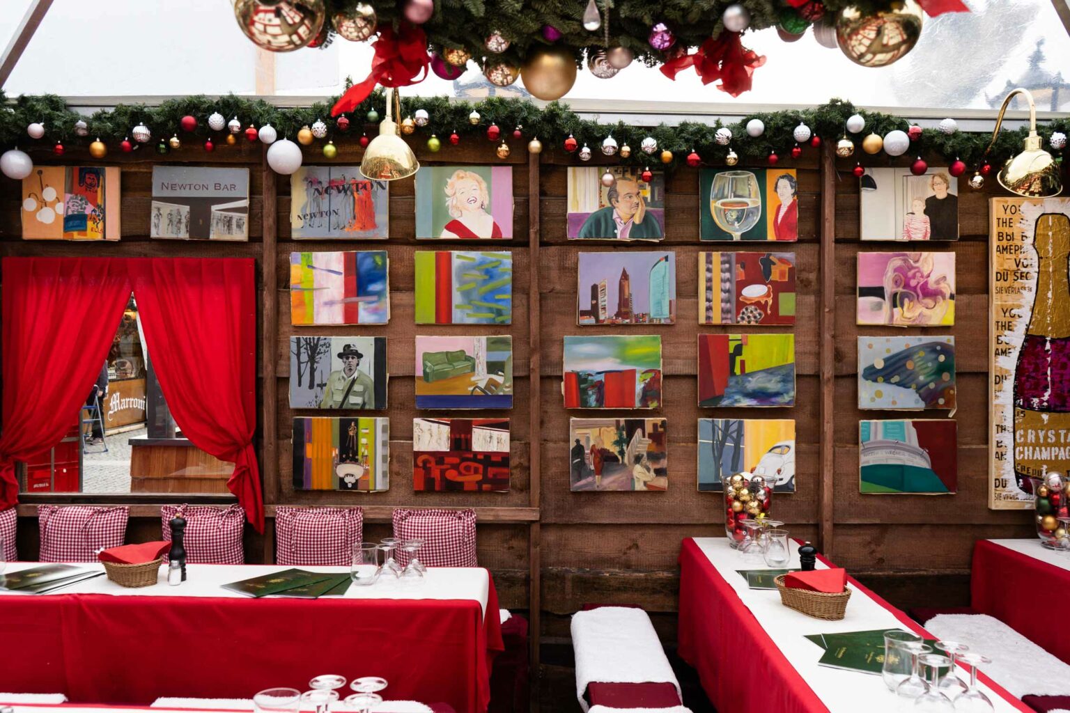 großer mobiler Bar-Tresen, runde Tische für bis zu 10 Personen,